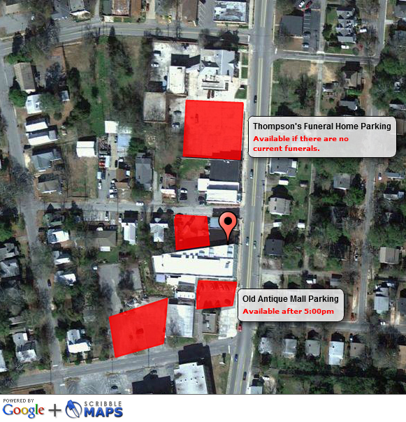 There also is parking BEHIND Old Mill Antique Mall (anytime), entering off of Augusta Street.